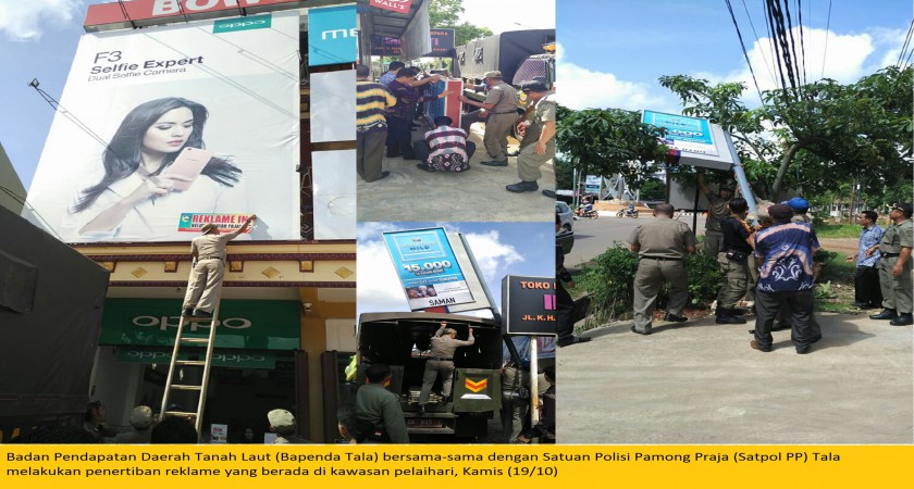 Tala-Kominfo, Dalam rangka menegakkan Peraturan Daerah Nomor 13 Tahu 2011 tentang Pajak Daerah, Badan Pendapatan Daerah Tanah Laut (Bapenda Tala) bersama-sama dengan Satuan Polisi Pamong Praja (Satpol PP) Tala melakukan penertiban reklame yang berada di kawasan pelaihari, Kamis (19/10). Adapun reklame yg ditertibkan adalah yang belum membayar pajak maupun yang sudah berakhir masa pemasangannya. Kepala Bapenda Tala Surya Arifani disela-sela penertiban mengatakan bahwa sebelum penertiban para pemilik reklame sudah diberitahu tentang kewajiban atas pajak tersebut. "Mudah-mudahan dengan kegiatan penertiban ini para wajib pajak semakin sadar akan kewajiban membayar pajak, sehingga Pendapatan Asli Daerah (PAD) dari sumber pajak daerah akan lebih meningkat lagi untuk membiayai pembangunan Tala" harap Surya. Adapun lokasi penertiban hari ini adalah Kecamatan Pelaihari dan Kecamatan Bati-Bati. Untuk di lokasi lainnya akan dijadwalkan secara periodik.