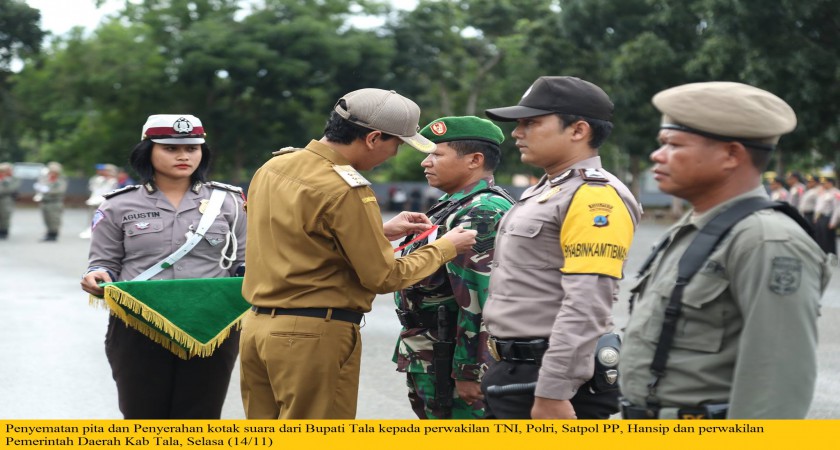Dalam kesempatan ini juga turut dilakukan penyematan pita dan penyerahan kotak suara dari Bupati Tala kepada perwakilan TNI, Polri, Satpol PP, Hansip dan perwakilan Pemerintah Daerah Kab Tala.